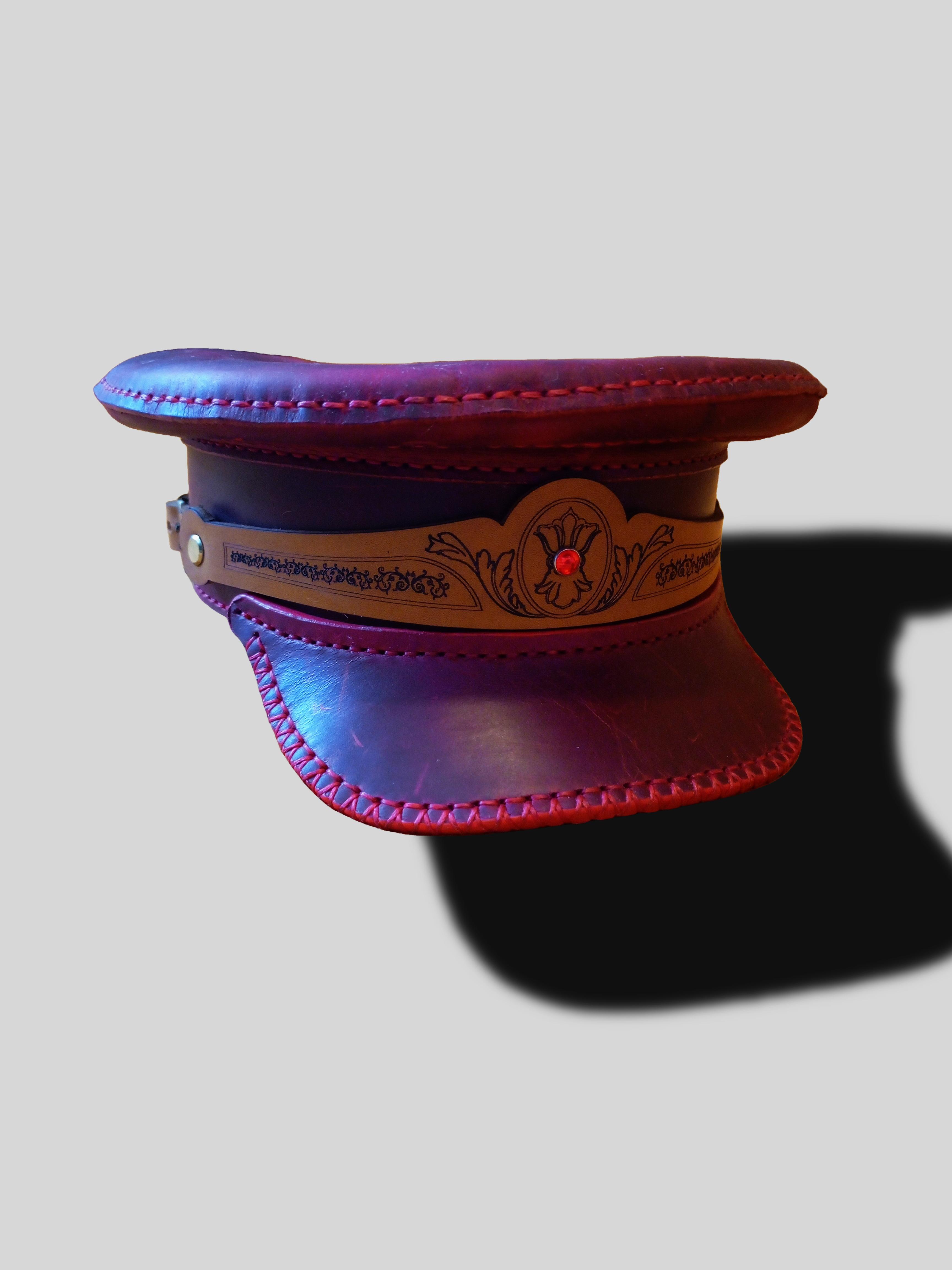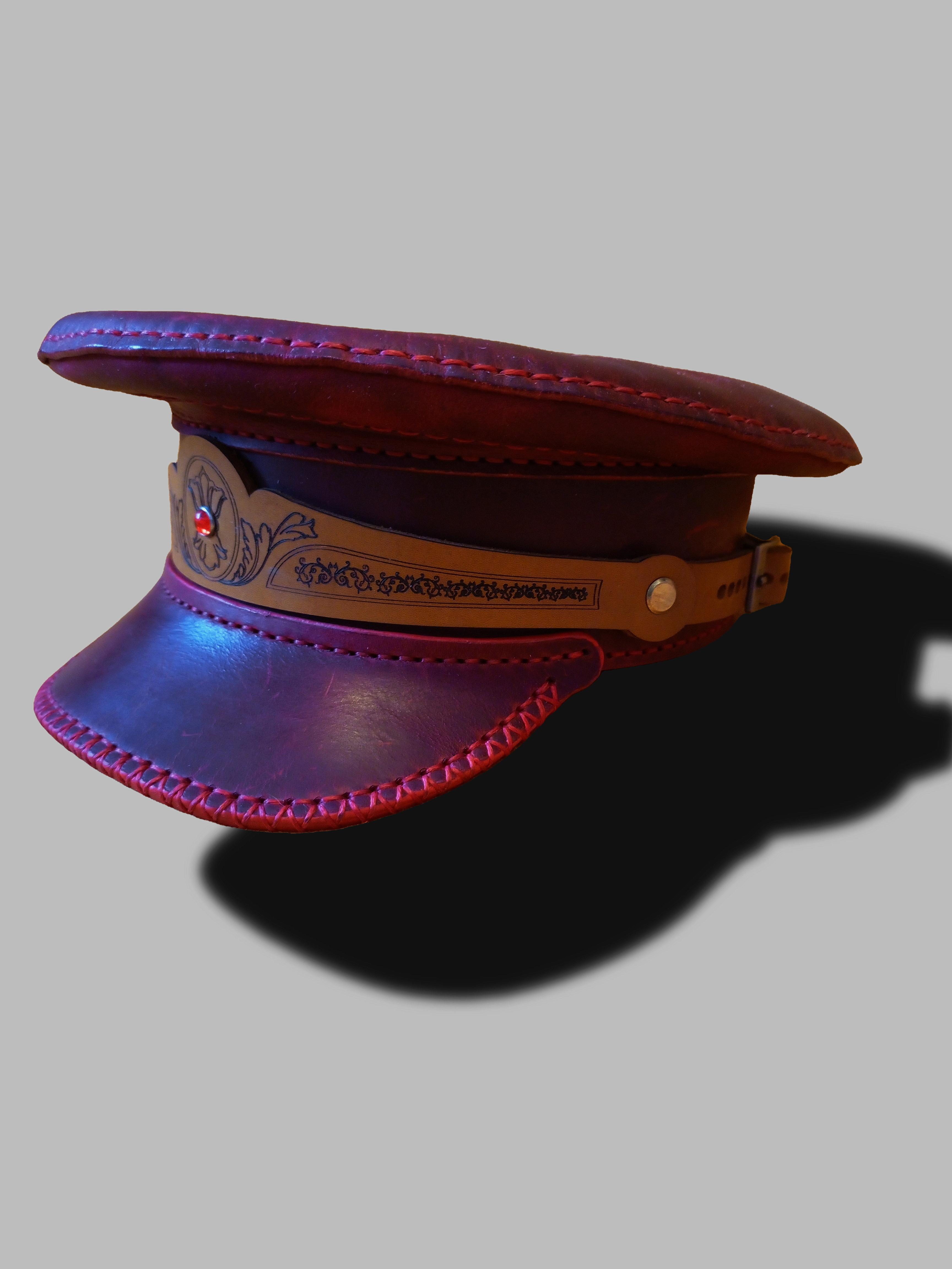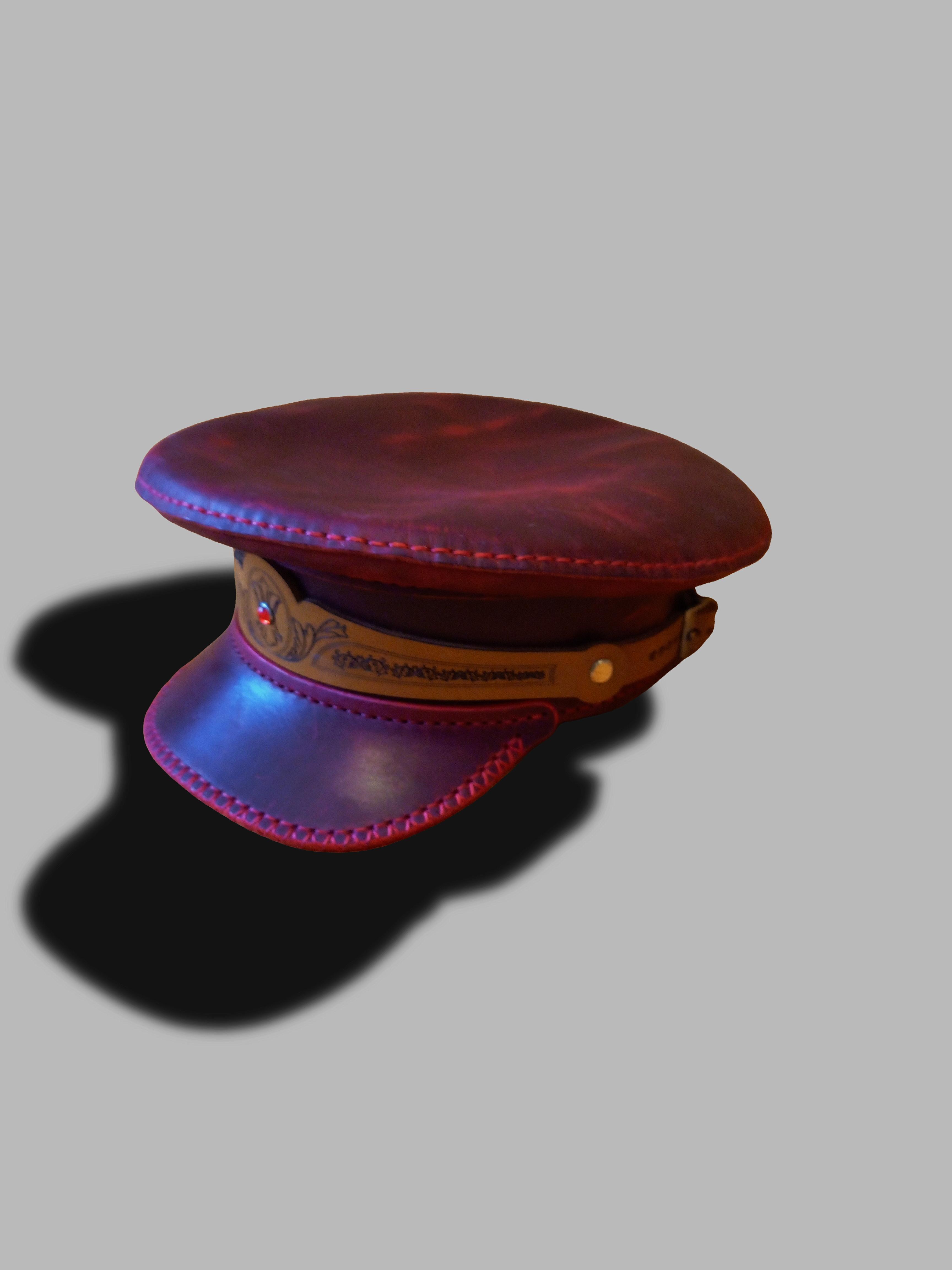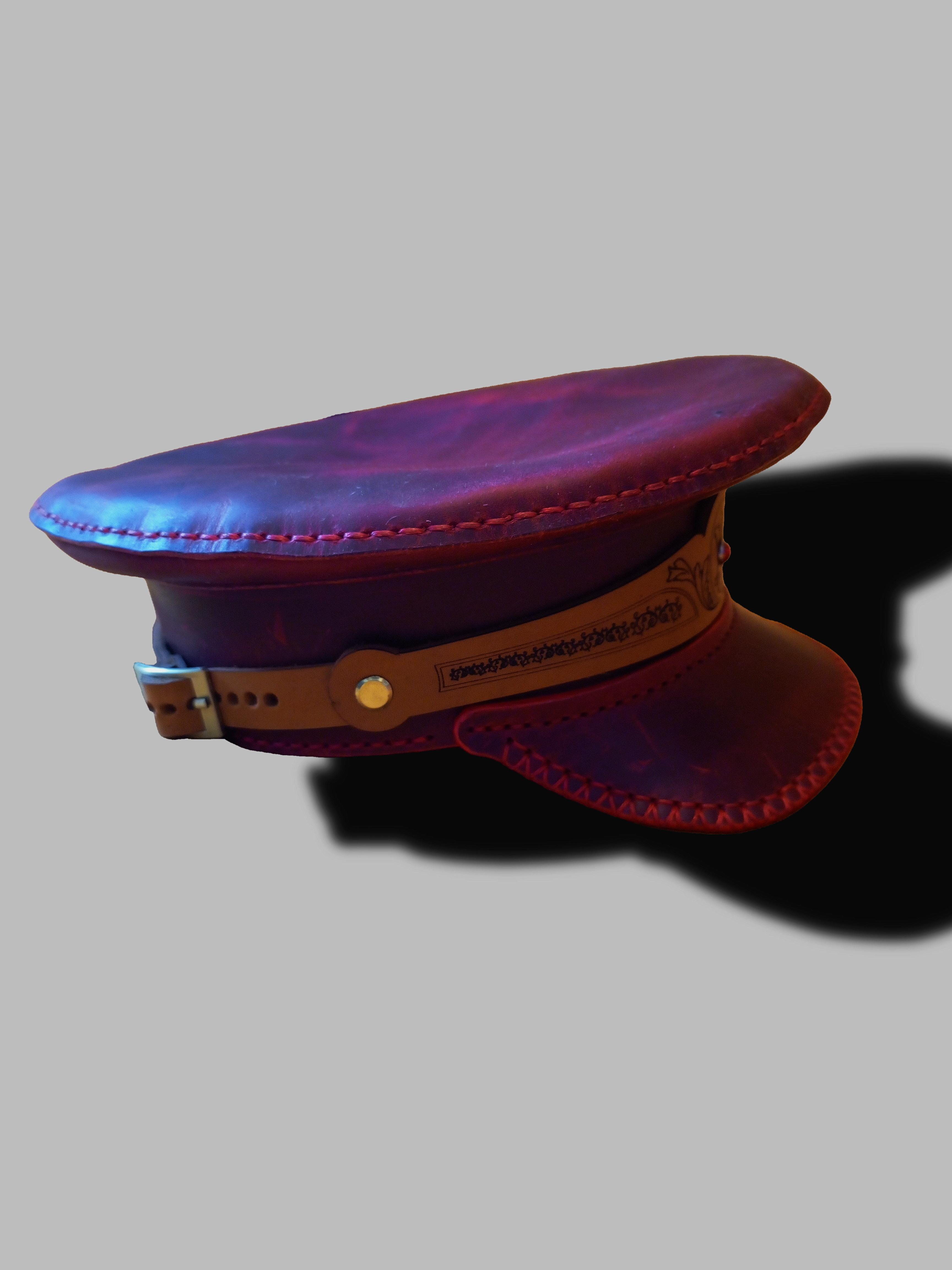 Картуз из - натуральной вощёной кожи Crazy Horse премиум-класса, красного цвета. Гравировка лазерная. Регулирующий ремешок сзади. Размер 53.